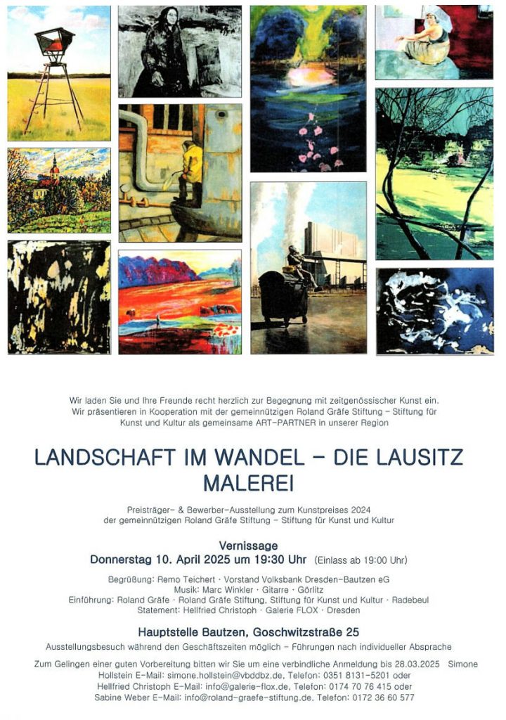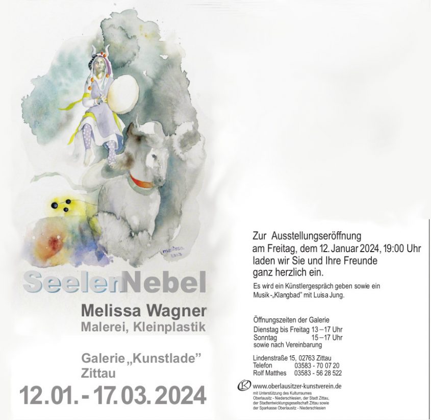 10.04.2025 – 13.06.2025 VOLKSBANK BAUTZEN 12.01.2024 – 17.03.2024 GALERIE KUNSTLADE 15.07.2022 – 04.09.2022 GALERIE ART FACTORY FLOX 12.03.2022 – 08.05.2022 GALERIE ARKADENHOF 12.12.2021 – 27.02.2022 WANDERAUSSTELLUNG Zusammentreffen – Gemeinschaftsausstellung der Via-Regia-Stipendiat*innen 2014-2021 http://kunststation-kleinsassen.de/zusammentreffen-gemeinschaftsausstellung-der-via-regia-stipendiaten-2014-2021/http://kunststation-kleinsassen.de/wp-content/uploads/2021/12/Broschu%CC%88re_Via_Regia_WEB.pdf 29.06.2021 – 11.08.2021 SPARKASSE ZITTAU 20.11.2018 – 10.01.2019 RATHAUSGALERIE HILDERS GÖTTINNENDÄMMERUNGWerke von Melissa Wagner in Öl, Aquarell und KeramikVernissage am Dienstag, 20.11.2018 um 19 Uhr 14.10. – 11.11.2018 KUNSTSTATION KLEINSASSEN 26.01. – 02.03.2018 GALERIE BUDISSIN 17.02. – 12.03.2017 GALERIE NEUN 14.10. – 24.10.2013 GALERIE KUNSTRAUM SCHMIDGASSE